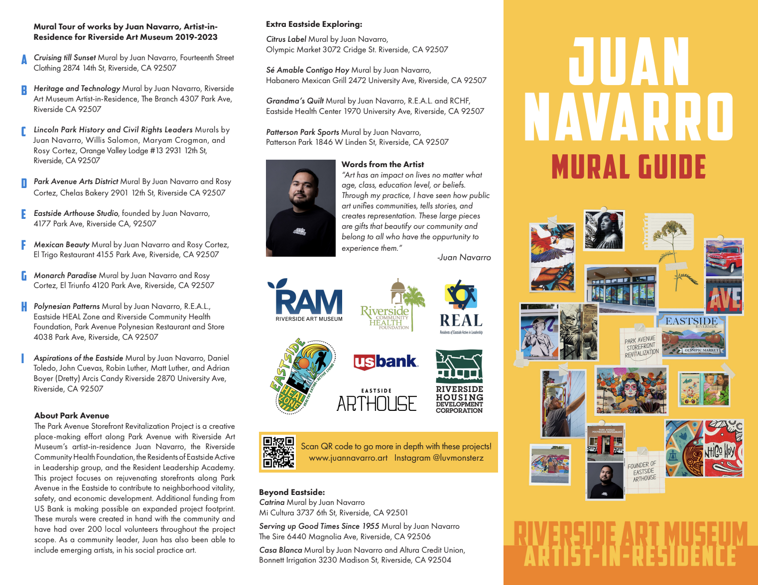 The Park Avenue Storefront Revitalization Project is a creative place-making effort along Park Avenue with Riverside Art Museum’s artist-in-residence Juan Navarro, the Riverside Community Health Foundation, the Residents of Eastside Active in Leadership group, and the Resident Leadership Academy. The Park Avenue Storefront Revitalization Project focuses on rejuvenating storefronts along Park Avenue in the Eastside to contribute to neighborhood vitality, safety, and economic development. Additional funding from US Bank is making possible an expanded project footprint. These murals were created in hand with the community and have had over 200 local volunteers throughout the project scope. As a community leader, Juan has also been able to include emerging artists, in his social practice art.